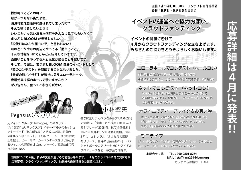 まつぶしBLOOMでは、2026年8月2日に歌のコンテストを予定しています。